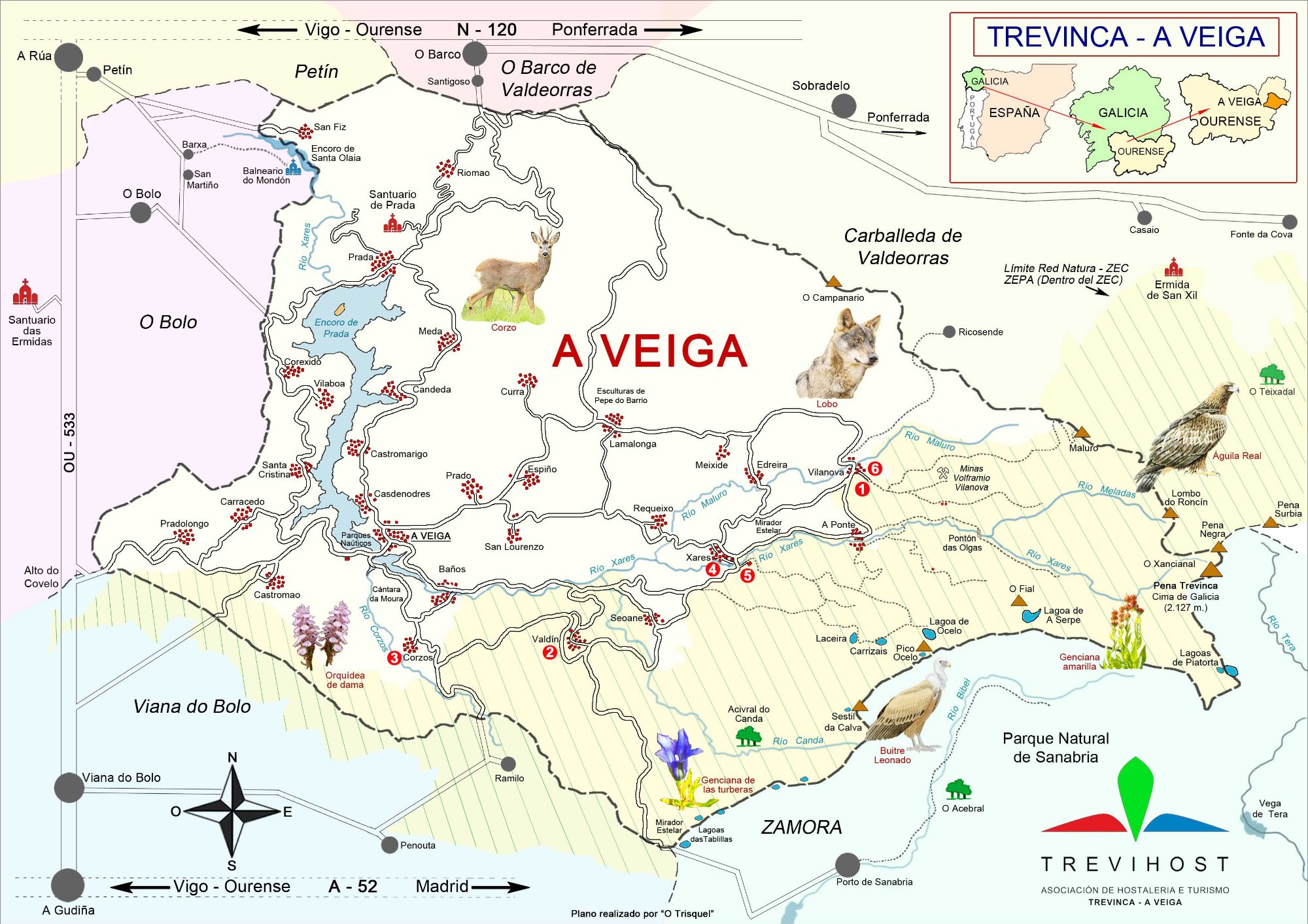 El mapa TREVIHOST — elaborado por O Trisquel para la Asociación de Hostalería y Turismo Trevinca-A Veiga — muestra los 6 puntos de interés numerados, accesos, aldeas, ríos, fauna emblemática y los límites de la ZEC/ZEPA Pena Trevinca.